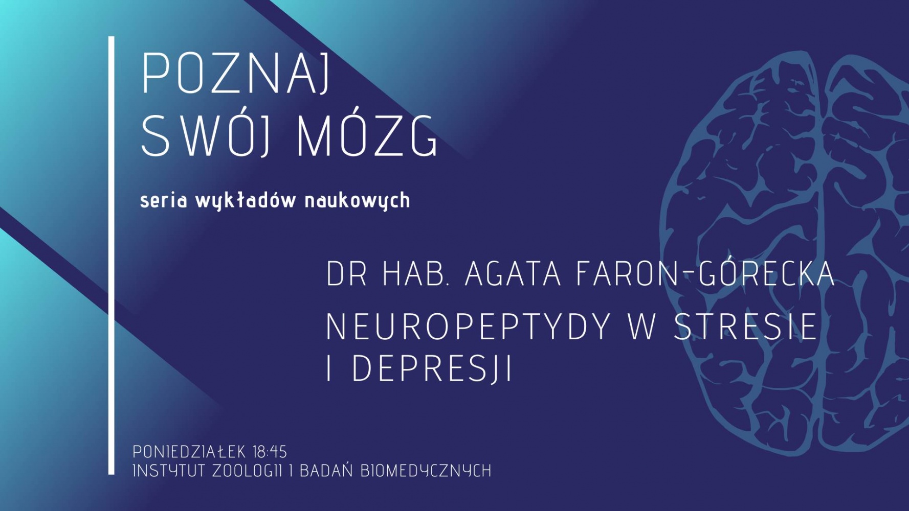 27 stycznia 2020 r. o godzinie 18:45 w Instytucie Zoologii i Badań Biomedycznych Uniwersytetu Jagiellońskiego odbędzie się wykład dr hab. Agaty Faron-Góreckiej z Pracowni Farmakologii Biochemicznej Zakładu Farmakologii Molekularnej IF PAN. Będzie to drugi wykład organizowany przez Koło Naukowe Neuronus w ramach cyklu "Poznaj swój mózg".